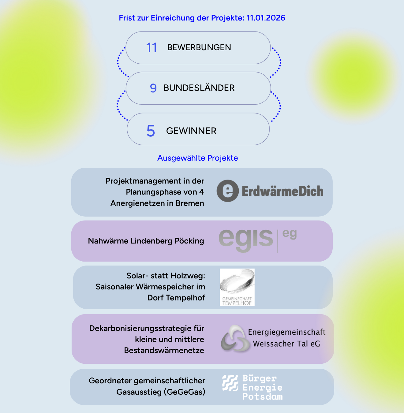 Innovative Wärme-Projekte können im Rahmen der Bürgerenergie-Innovationscommunity „CommunitE“ mit 100.000€ gefördert werden. Die Frist zu Einreichung von Projekten für diese Förderung lief bis zum 11.01.2026.