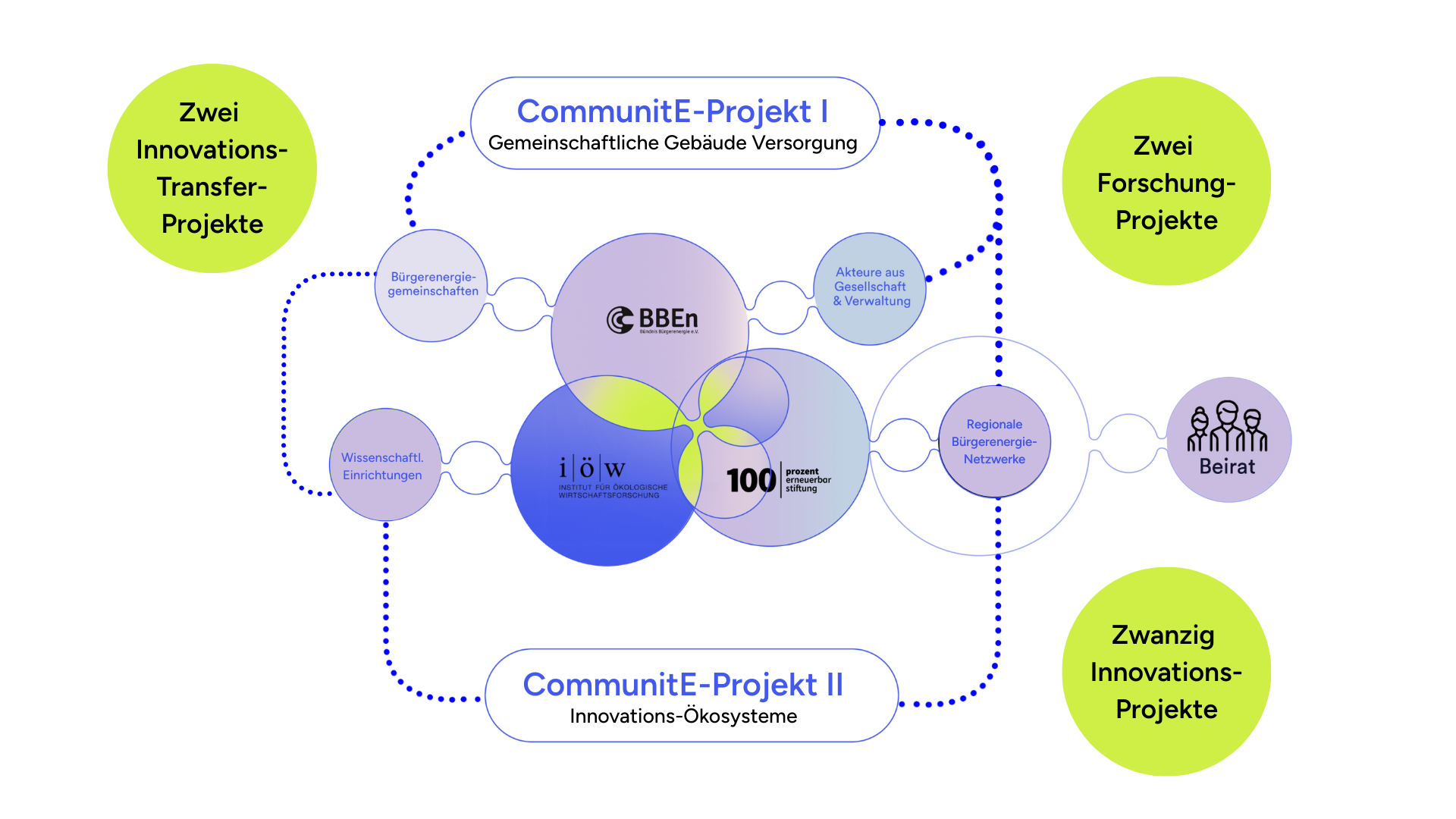 Wir fördern unterschiedliche Arten von Projekten, die gemeinsam die Bürgerenergie voranbringen: Innovationsprojekte, Forschungsprojekte und Transferprojekte. Dabei geht es sowohl um technische als auch um soziale Innovationen – von erneuerbarer Wärmeversorgung über Mieterstrom bis hin zu neuen Organisationsmodellen für Bürgerenergie. Insgesamt werden 10–20 Innovationsprojekte, zwei Forschungsprojekte und zwei Transferprojekte umgesetzt.